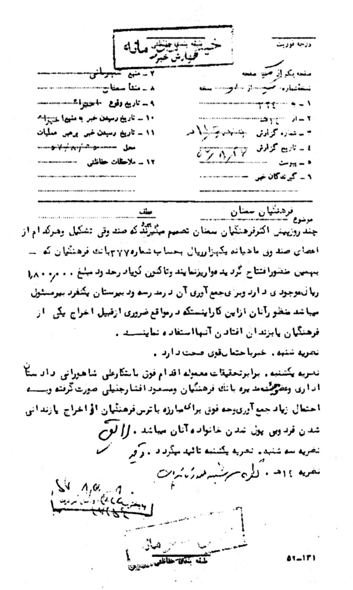 چند روز پیش اکثر فرهنگیان سمنان تصمیم میگیرند که صندوقى تشکیل و هرکدام از اعضاى صندوق ماهیانه یکهزار ریال به حساب شماره 377 بانک فرهنگیان که به همین منظور افتتاح گردیده واریز نمایند و تاکنون گویا در حدود مبلغ 000 / 800 / 1 ریال موجودى دارد و براى جمعآورى آن در مدرسه و دبیرستان یکنفر دبیر مسئول میباشد منظور آنان از این کار اینست که در مواقع ضرورى از قبیل اخراج یکى از فرهنگیان یا به زندان افتادن آنها استفاده نمایند.