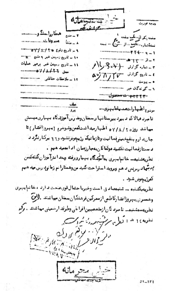 نامبرده بالا که دبیر دبیرستانهاى سمنان و مدرس آموزشگاه بهیارى مهستى میباشد روز 25 / 8 / 57 اظهار میداشت که من و شوهرم (بهروز افشار) تا جان داریم به نفع خمینى فعالیت و تا زمانی که عوض نشود و 66 [شاه] برکنار نگردد دست از فعالیت نکشیده و کماکان به مبارزهمان ادامه میدهیم.