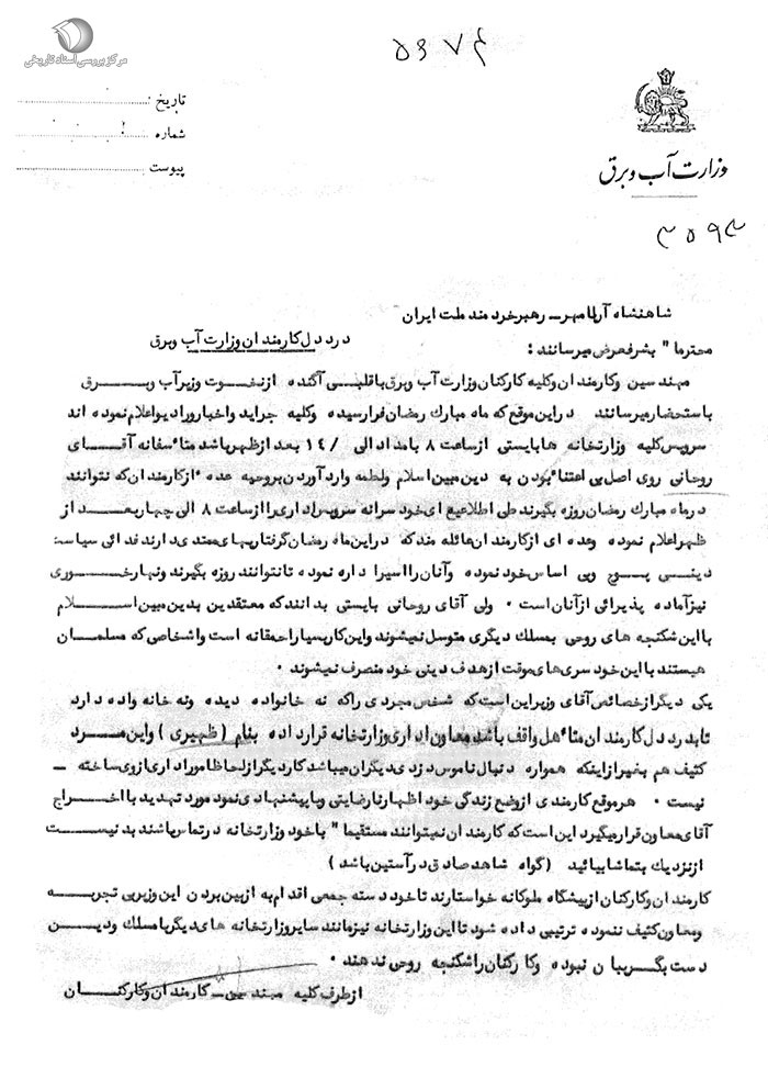 مهندسین و کارمندان و کلیه کارکنان وزارت آب و برق با قلبی آکنده از نخوت وزیر آب و برق به استحضار میرسانند در این موقع که ماه مبارک رمضان فرا رسیده و کلیه جراید و اخبار و رادیو اعلام نمودهاند سرویس کلیه وزارتخانهها بایستی از ساعت 8 بامداد الی / 14 بعدازظهر باشد، متأسفانه آقای روحانی روی اصل بیاعتناء بودن به دین مبین اسلام و لطمه وارد آوردن به روحیه عدهای از کارمندان که نتوانند در ماه مبارک رمضان روزه بگیرند طی اطلاعیهای خودسرانه سرویس اداری را از ساعت 8 الی چهار بعد از ظهر اعلام نموده و عدهای از کارمندان عائلهمند که در این ماه رمضان گرفتاریهای ممتدی دارند فدائی سیاست دینی پوچ و بی اساس خود نموده و آنان را اسیر اداره نموده تا نتوانند روزه بگیرند و نهارخوری نیز آماده پذیرائی از آنان است. ولی آقای روحانی بایستی بدانند که معتقدین به دین مبین اسلام با این شکنجههای روحی به مسلک دیگری متوسل نمیشوند و این کار بسیار احمقانه است و اشخاصی که مسلمان هستند با این خودسریهای موقت از هدف دینی خود منصرف نمیشوند.