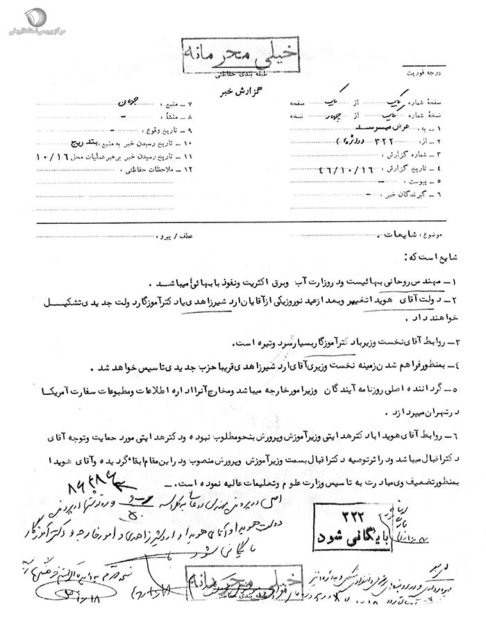 6- روابط آقای هویدا با دکتر هدایتی وزیر آموزش و پرورش به نحو مطلوب نبوده و دکتر هدایتی مورد حمایت و توجه آقای دکتر اقبال میباشد و در اثر توصیه دکتر اقبال به سمت وزیر آموزش و پرورش منصوب و در این مقام ابقاء گردیده و آقای هویدا به منظور تضعیف وی مبادرت به تأسیس وزارت علوم و تعلیمات عالیه نموده است.