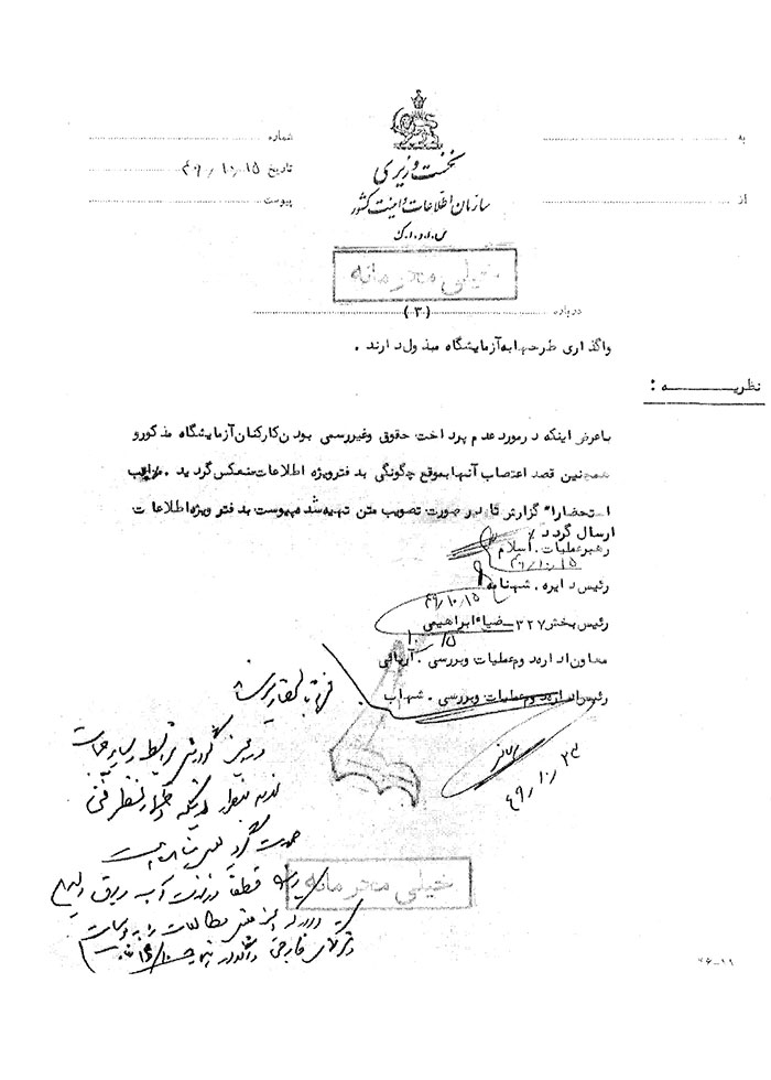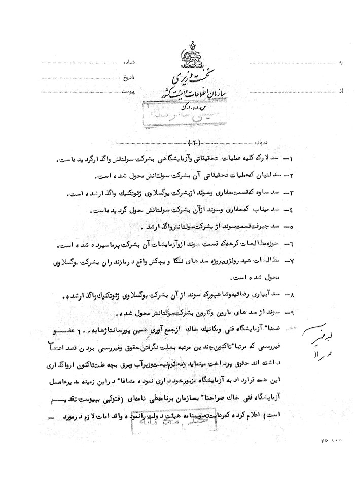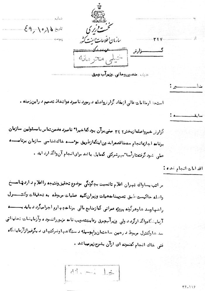 اقدامات انجام شده: مراتب به ساواک تهران اعلام تا نسبت به چگونگی موضوع تحقیق و نتیجه را اعلام دارد پاسخ واصله حاکیست طبق تصویب نامه هیئت وزیران کلیه عملیات مربوطه به تحقیقات و کنترل راهها و سدها و هرگونه پروژه عمرانی که از منابع مالی برنامه چهارم اجرا میگردد باید به آزمایشگاه واگذار گردد ولی وزیر آب و برق رعایت تصویب نامه مزبور را ننموده و آزمایشات تحقیقاتی سدها و کنترل مربوط در حین ساختمان را به وسیله دستگاهها و شرکتهای دیگر غیر از آزمایشگاه فنی خاک انجام، که نمونهای از آن به شرح زیر میباشد:
