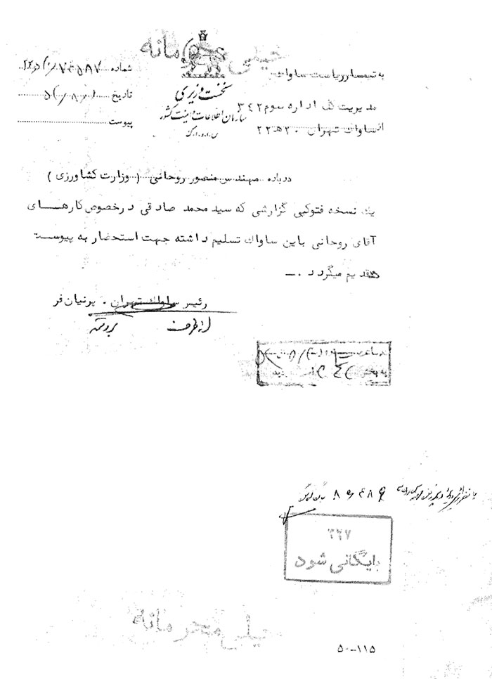 یک نسخه فتوکپی گزارشی که سیدمحمد صادقی در خصوص کارهای آقای روحانی به این ساواک تسلیم داشته جهت استحضار به پیوست تقدیم میگردد.