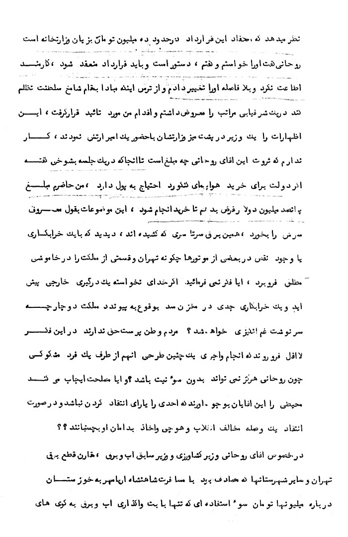 نظر میدهد که انعقاد این قرارداد در حدود ده میلیون تومان به زیان وزارتخانه است روحانی گفت او را خواستم و گفتم، دستور است و باید قرارداد منعقد شود، کارمند اطاعت نکرد و بلافاصله او را تغییر دادم و از ترس اینکه مبادا به مقام شامخ سلطنت تظلم کند در یک شرفیابی مراتب را معروض داشتم و اقدام من مورد تائید قرار گرفت. این اظهارات را یک وزیر در پشت میز وزارتشان با حضور یک امیر ارتش نمودند، کار ندارم که ثروت این آقای روحانی چه مبلغ است تا آنجا که در یک جلسه به شوخی گفته اگر دولت برای خرید هواپیمای کنکورد احتیاج به پول دارد، من حاضرم مبلغ پانصد میلیون دلار قرض بدهم تا خرید انجام شود، این موضوعات به قول معروف سرش را بخورد، همین برق سرتاسری که کشیدهاند، دیدید که با یک خرابکاری یا وجود نقص در یکی از موتورها چگونه تهران و قسمتی از مملکت را در خاموشی مطلق فرو برد، آیا فکر نمیفرمائید اگر خدای نخواسته یک درگیری خارجی پیش آید و یک خرابکاری جدی در مخزن سد به وقوع بپیوندد مملکت دچار چه سرنوشت غمانگیزی خواهد شد؟ مردم وطنپرست حق ندارند در این فکر لااقل فرو روند که انجام و اجرای یک چنین طرحی آن هم از طرف یک فرد مشکوکی چون روحانی هرگز نمیتواند بدون سوءنیت باشد؟ و آیا مصلحت ایجاب میکند محیطی را این آقایان به وجود آورند که احدی را یارای انتقاد کردن نباشد و در صورت انتقاد یک وصله مخالف انقلاب و هوچی و اخاذ به دامان او بچسبانند؟؟