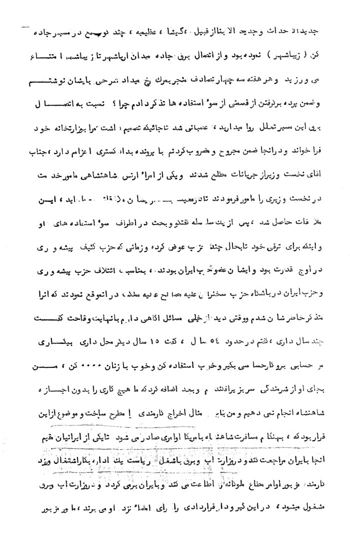 در خصوص آقای روحانی وزیر کشاورزی و وزیر سابق آب و برق، مقارن قطع برق تهران و سایر شهرستانها که مصادف بود با مسافرت شاهنشاه آریامهر به خوزستان درباره میلیونها تومان سوءاستفادهای که تنها بابت واگذاری آب و برق به کویهای جدیدالاحداث و جدیدالابنا از قبیل، گیشا، کوی عظیمیه، چند کوی واقع در مسیر جاده کن (زیبا شهر) نموده بود و از اتصال برق جاده میدان آریاشهر تا زیباشهر امتناع میورزید و هر هفته سه چهار تصادف منجر به مرگ رخ میداد، شرحی به ایشان نوشتم و ضمن پرده برگرفتن از قسمتی از سوءاستفادهها تذکر دادم چرا نسبت به اتصال برق این مسیر تعلل روا میدارید؟ عصبانی شد تا جائی که تصمیم داشت مرا به وزارتخانه خود فراخواند و در آنجا ضمن مجروح و مضروب کردنم با پرونده به دادگستری اعزامم دارد، جناب آقای نخستوزیر از جریانات مطلع شدند و یکی از امراء ارتش شاهنشاهی مأمور به خدمت در نخستوزیری را مأمور فرمودند تا در معیت بنده از ایشان ملاقاتی به عمل آید، این ملاقات حاصل شد، پس از یک سلسله گفتگو و بحث در اطراف سوءاستفادههای او و اینکه برای ترقی خود تا به حال چند حزب عوض کرده و زمانی که حزب کثیف پیشهوری[1] در اوج قدرت بود و ایشان عضو حزب ایران بودند، به مناسبت ائتلاف حزب پیشهوری و حزب ایران در باشگاه حزب سخنرانی علیه مصالح عالیه مملکت، در آن موقع نمودند که آن را متذکر خاطرشان شدم و وقتی دید از خیلی مسائل آگاهی دارم با نهایت وقاحت گفت چند سال داری، گفتم در حدود 54 سال، گفت 15سال دیگر محل داری، بیکاری مرد حسابی برو کار حسابی بگیر و خوب استفاده کن و خوب با زنان. ...[2] کن، من به جای او از شرمندگی سر به زیر افکندهام و بعد اضافه کرد که: ما هیچ کاری را بدون اجازه شاهنشاه انجام نمیدهیم و منباب مثال اخراج کارمندی را مطرح ساخت و موضوع از این قرار بود که، به هنگام مسافرت شاهنشاه به آمریکا اوامری صادر میشود تا یکی از ایرانیان مقیم آنجا به ایران مراجعت کند و در وزارت آب و برق با شغل ریاست یک اداره به کار اشتغال ورزد. کارمند مزبور اوامر مطاع ملوکانه را اطاعت میکند و به ایران برمیگردد و در وزارت آب و برق مشغول میشود، در این گیرودار قراردادی را برای امضاء نزد او میبرند، مأمور مزبور