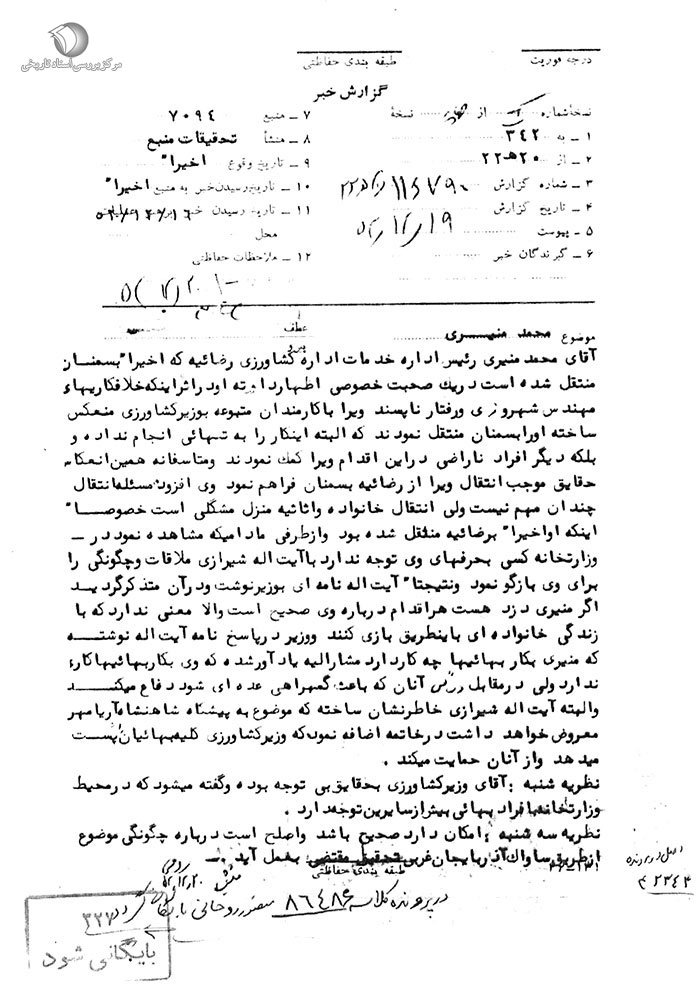 آقای محمد منیری رئیس اداره خدمات اداره کشاورزی رضائیه که اخیراً به سمنان منتقل شده است در یک صحبت خصوصی اظهار داشته: او در اثر اینکه خلافکاریهای مهندس شهروزی و رفتار ناپسند وی را با کارمندان متبوعه به وزیر کشاورزی منعکس ساخته او را به سمنان منتقل نمودند که البته اینکار را به تنهایی انجام نداده و بلکه دیگر افراد ناراضی در این اقدام وی را کمک نمودند و متأسفانه همین انعکاس حقایق موجب انتقال وی را از رضائیه به سمنان فراهم نمود. وی افزوده: مسئله انتقال چندان مهم نیست ولی انتقال خانواده و اثاثیه منزل مشکلی است خصوصاً اینکه او اخیراً به رضائیه منتقل شده بود و از طرفی مادامی که مشاهده نمود در وزارتخانه کسی به حرفهای وی توجه ندارد با آیتاله شیرازی ملاقات و چگونگی را برای وی بازگو نمود و نتیجتاً آیتاله نامهای به وزیر نوشت و در آن متذکر گردید اگر منیری دزد هست هر اقدام درباره وی صحیح است والا معنی ندارد که با زندگی خانوادهای به این طریق بازی کنند و وزیر در پاسخ نامه آیتاله نوشته که منیری به کار بهائیها چه کار دارد. مشارالیه یادآور شده که وی به کار بهائیها کاری ندارد ولی در مقابل دسائس آنان که باعث گمراهی عدهای شود دفاع میکند و البته آیتاله شیرازی خاطر نشان ساخته که موضوع به پیشگاه شاهنشاه آریامهر معروض خواهد داشت. در خاتمه اضافه نمود که: وزیر کشاورزی کلیه بهائیان را پست میدهد و از آنان حمایت میکند.