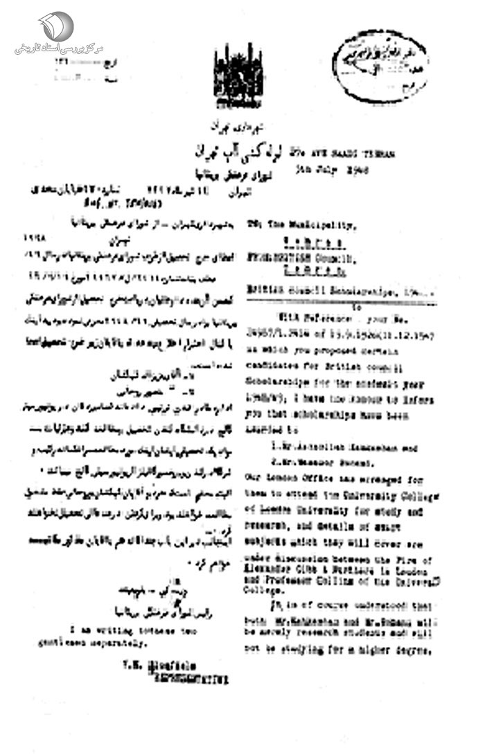 اداره ما در لندن ترتیبى دادهاند که نامبردگان در یونیورسیتى کالج در دانشگاه لندن تحصیل و مطالعه کنند و جزئیات مواد تحصیلى ایشان اینک مورد مطالعه سر الکساندرکیب و شرکاء در لندن و پروفسور کالینز از یونیورسیتى کالج مىباشد.