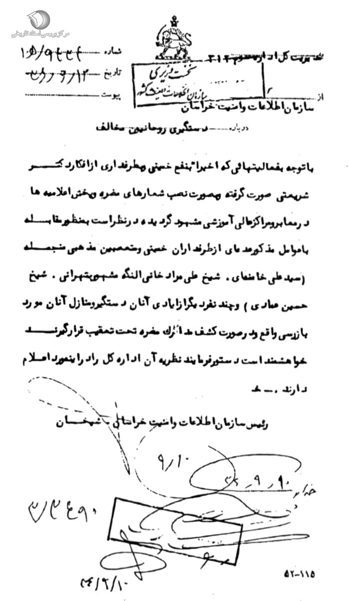با توجه به فعالیتهائى که اخیراً به نفع خمینى و به طرفدارى از افکار دکتر شریعتى صورت گرفته و به صورت نصب شعارهاى مضره و پخش اعلامیهها در معابر و مراکز عالى آموزشى مشهود گردیده، در نظر است به منظور مقابله با عوامل مذکور عدهاى از طرفداران خمینى و متعصبین مذهبى منجمله (سید على خامنهاى. شیخ على مرادخانى النگه مشهور به تهرانى. شیخ حسین عمادى) و چند نفر دیگر از ایادى آنان دستگیر و منازل آنان مورد بازرسى واقع و در صورت کشف مدارک مضره تحت تعقیب قرار گیرند. خواهشمند است دستور فرمایند نظریه آن اداره کل را در این مورد اعلام دارند.[1]