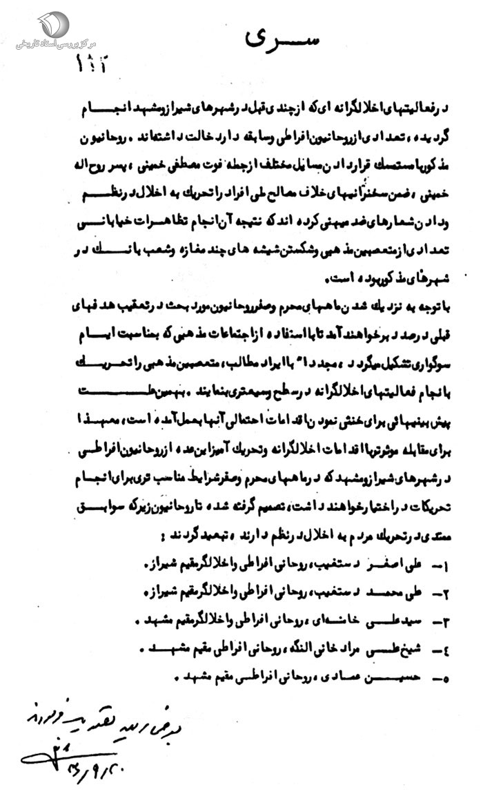 با توجه به نزدیک شدن ماههاى محرم و صفر، روحانیون مورد بحث در تعقیب هدفهاى قبلى در صدد بر خواهند آمد تا با استفاده از اجتماعات مذهبى را تحریک به انجام فعالیتهاى اخلالگرانه در سطح وسیعتری بنمایند. به همین علت پیشبینیهائی برای خنثی نمودن اقدامات آنها به عمل آمده است معهذا برای مقابله مؤثرتر با اقدامات اخلالگرانه و تحریک آمیز این عده از روحانیون افراطى در شهرهاى شیراز و مشهد که در ماههاى محرم و صفر شرایط مناسبترى براى انجام تحریکات در اختیار خواهند داشت، تصمیم گرفته شده تا روحانیون زیر که سوابق ممتدى در تحریک مردم به اخلال در نظم دارند، تبعید گردند: