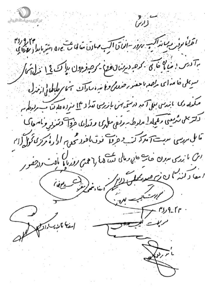 احتراماً به عرض میرساند، اکیپ بهروز به اتفاق اکیپ صادق مقارن ساعت 30 / 5 دقیقه بامداد 23 / 9 / 36 روز جارى به آدرس: خیابان خاکى ـ کوچه دبیرستان فروغ ـ کوچه فریدون، پلاک 14، منزل آقاى سید على خامنهاى مراجعه و با حضور خودش و نماینده ساواک آقاى طباطبائى از منزل مسکونى وى بازرسى به عمل آمد در نتیجه این بازرسى تعداد 13 سیزده جلد کتاب مربوط به دکتر على شریعتى و یک جلد مربوط به مرتضى مطهرى و تعدادى جزوات دستنویس و نامههاى قابل بررسى به دست آمد که کتب و جزوات فوق با خود شخص به اداره مرکزى تحویل گردیده است. بازرسى بدون خسارت جانى و مالى در ساعت 45 / 6 همین روز پایان یافت و در حضور امضاءکنندگان زیر صورتمجلس گردید.