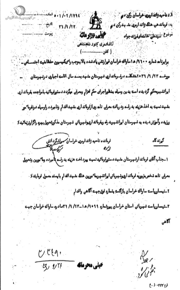 1ـ جناب آقاى فرماندار شهرستان مشهد دستور فرمائید نسبت به پرداخت هزینه بدرقه نامبرده و مأمورین و تحویل معرفىنامه شخص مزبور به فرماندارى و شهربانى ایرانشهر به مأمورین هنگ مشهد اقدام بایسته معمول فرمایند.