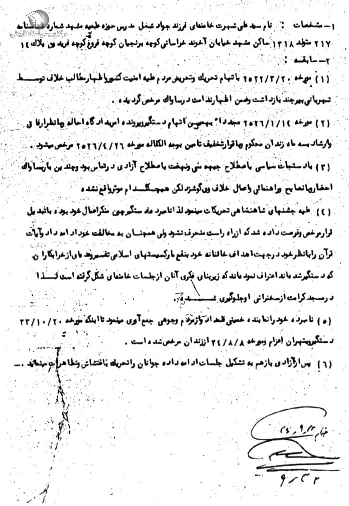 1 ـ مشخصات: نام سید على، شهرت خامنهاى، فرزند جواد، شغل مدرس حوزه علمیه مشهد، شماره شناسنامه 217، متولد 1318، ساکن مشهد، خیابان آخوند خراسانى، کوچه برنجیان، کوچه فروغ، کوچه فریدون، پلاک 14