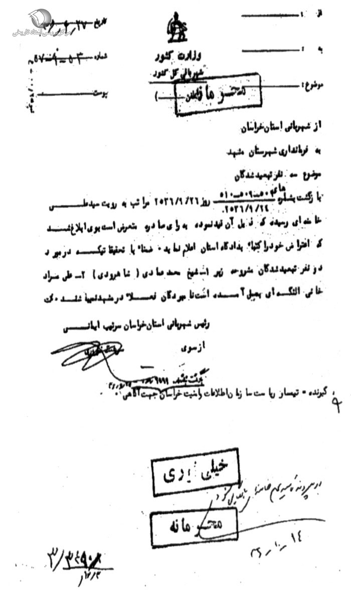 3 ـ تیمسار ریاست شهربانى استان خراسان پیرو شماره 9599 / ه 1 ـ 23 / 9 / 36 صادره ساواک خراسان جهت آگاهى.