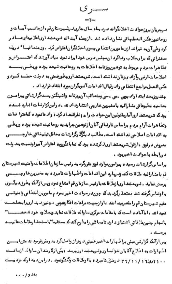 به علاوه متعاقب حوادث اخیر قم با انجام تظاهرات از طرف حزب رستاخیز ملت ایران نشان داده شد که خمینى عملاً علیه مقام شامخ سلطنت تلاش مىکند و وانمود گردید که اعتراضها و مخالفتها علیه شخص شاهنشاه است، در حالی که باید وانمود مىشد که در این مسایل پاى دولت در میان است نه مقام شامخ سلطنت. اینگونه اقدامات در نهایت اثراتى دارد که نمیتوان آنها را در رابطه با مصالح ملى و موجودیت مملکتى نادیده گرفت.