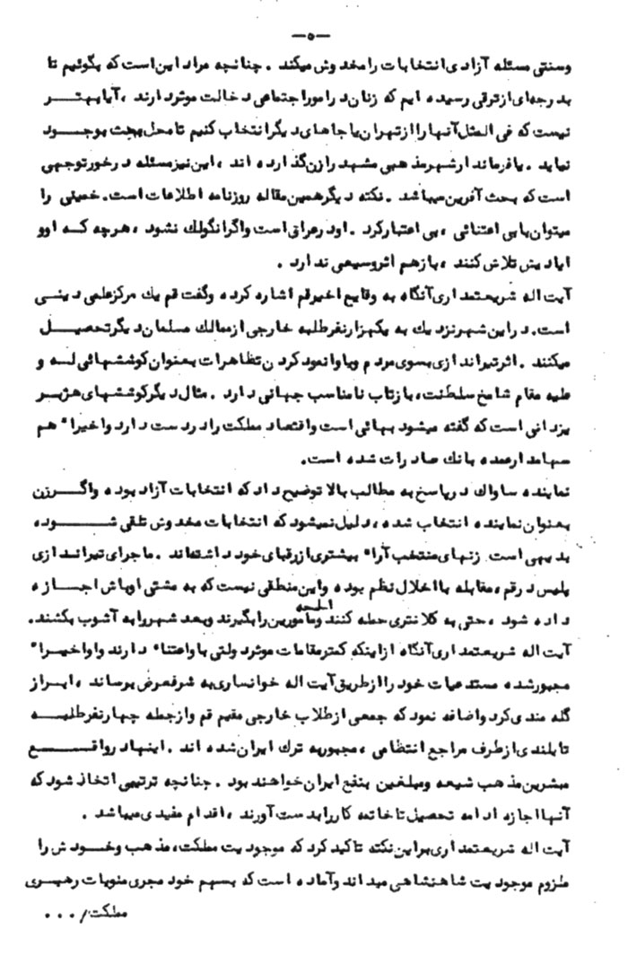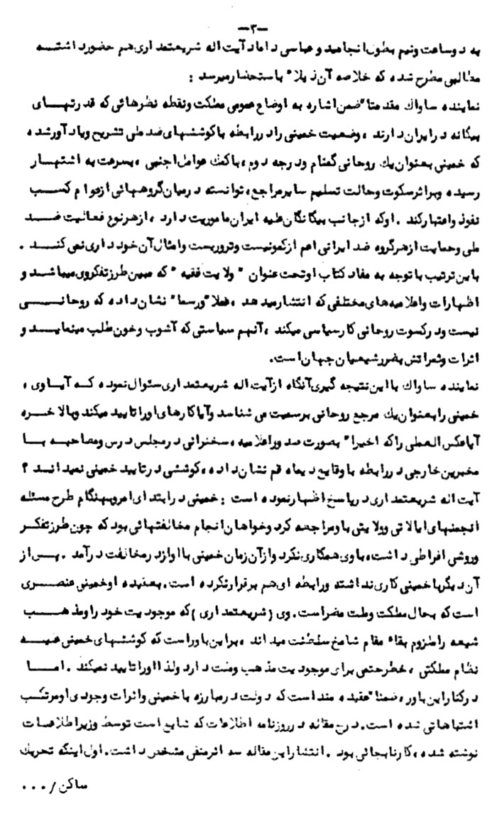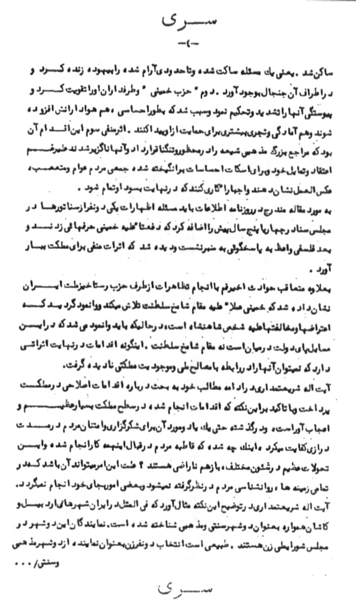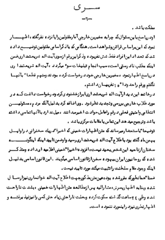 توضیحاً به استحضار میرساند که متن اظهارات خمینى که اخیراً در یک سخنرانى در اوایل بهمنماه گفته بود به اطلاع آیتاله شریعتمدارى رسید و او ضمن تایید این که اینگونه سخنان از ناحیه این شخص بعید نیست، افزوده، اخیراً خمینى اعلامیهاى داده و متذکر شده که روحانیون ایران بیهوده سخن از قانون اساسى میگویند. این قانون اساسى به دلیل اینکه وجود مقام سلطنت را تثبیت مىکند مورد تایید نیست.[13]