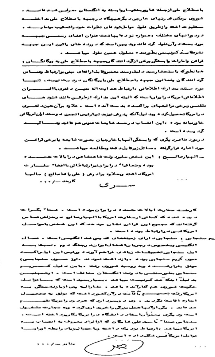 ضمنا به کرات دیده شده که کسانى از سفارت امریکا با الهیار صالح در منزلش تماس گرفتهاند که مجموع این قرائن نشان میدهد که این شخص با عوامل امریکایى در ارتباط بوده است.