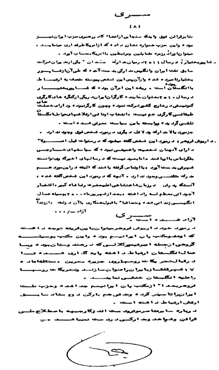 -شاپور بختیار: در سال 2511 [1331] در میان مدارک «سدان» یکى از مدیران شرکت سابق نفت ایران و انگلیس مدارکى به دست آمده که طى آن از شاپور بختیار نامبرده شده و از آن پس این شخص پیوسته متصف به ارتباط با انگلستان بوده است. ریشه این امر آن بوده که شاپور بختیار در سال 2510 [1330] به عنوان نماینده کارگران ایران در یکى از کنگرههاى کارگرى کمونیستى در خارج کشور شرکت نموده و چون کارگر نبوده و داراى خصلتهاى طبقاتى کارگرى هم نیست، انتخاب او ناشى از تلاشهاى عوامل انگلستان تلقى گردیده و وابسته به این سیاست معرفى شده است.