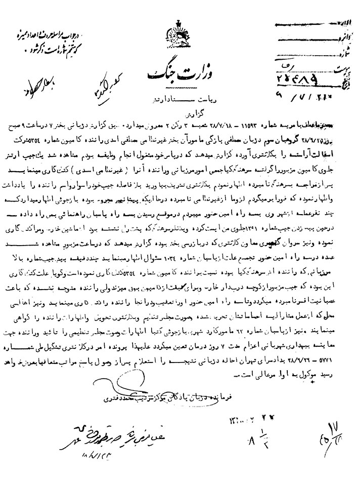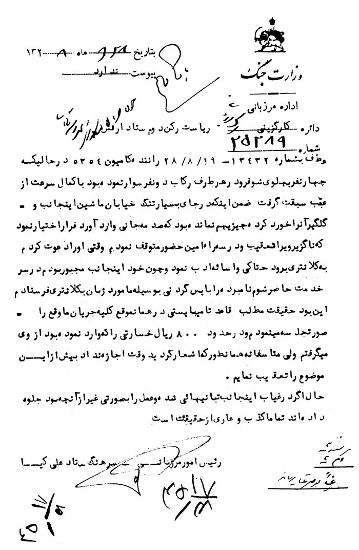 عطف به شماره 13432 – 19 / 8 / 28 راننده کامیون 5354 در حالی که چهار نفر پهلوی شوفر و در هر طرف رکاب دو نفر سوار نموده بود با کمال سرعت از عقب سبقت گرفت ضمن اینکه در جای بسیار تنگ خیابان ماشین اینجانب و گلگیر آن را خورد کرده، چیزی هم نمانده بود که صدمه جانی وارد آورد، فرار اختیار نمود که ناگزیر وی را تعقیب و در سه راه امین حضور متوقف نمودم. وقتی او را دعوت کردم به کلانتری برود هتاکی و اسائه ادب نمود و چون خود اینجانب مجبور بودم در سر خدمت حاضر شوم نامبرده را با پسگردنی به وسیله مأمور دژبان به کلانتری فرستادم. این بود حقیقت مطلب، قاعدتاً میبایستی در همان موقع کلیه جریان ما وقع را صورتجلسه مینمودم و در حدود 800 ریال خساراتی را که وارد نموده بود از وی میگرفتم، ولی متأسفانه همانطور که اشعار گردید وقت اجازه نداد بیش از این موضوع را تعقیب نمایم.