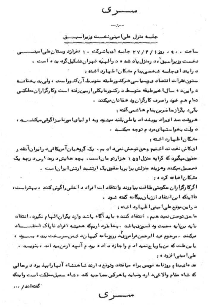 ساعت 0900 روز 1 / 4 / 37 جلسهاى با شرکت 10 نفر از دوستان على امینى نخست وزیر اسبق[1] در منزل یاد شده در الهیه تهران تشکیل گردیده است.