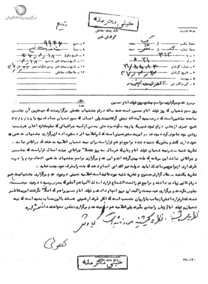 روز سوم شعبان که روز تولد امام حسین است همه ساله در قم جشنهاى مفصلى برگزار میشد که مهمترین آن جشن جامعه مبلغین است که در حسینیه آیتاله نجفى گرفته میشد ولى امسال که سوم شعبان مصادف بود با 18 / 4 / 37 هیچ خبری از جشن در قم نبود، شهر یک پارچه سکوت بود حتى بعضى از کسبهها چراغهائى که جلو مغازهشان هر شب روشن بود خاموش کرده بودند. و این به دستور خمینى است که در اعلامیهاش دستور داده از برگزارى جشنهاى مذهبى خوددارى کنند و به طوری که شنیده شده مراجع قم هم قرار است براى نیمه شعبان اعلامیه بدهند که چراغانى نباشد.