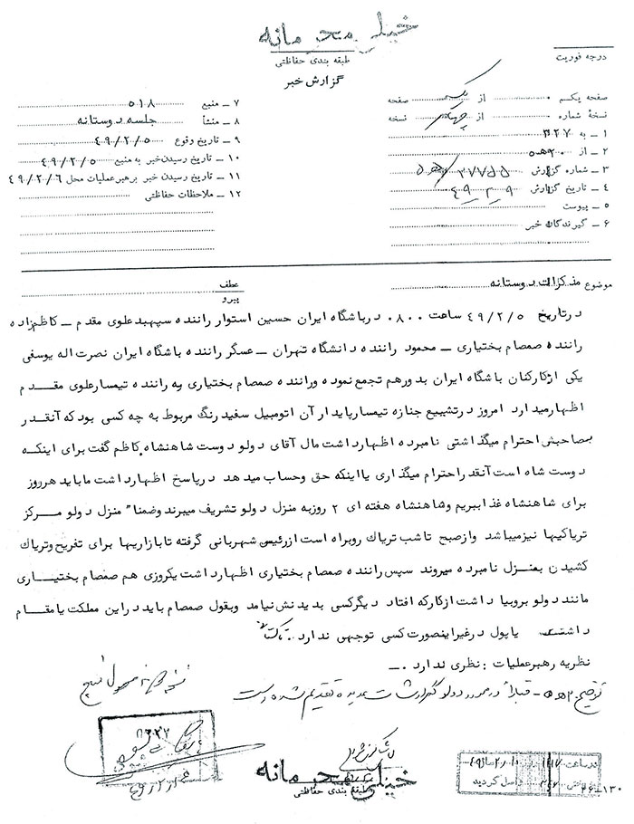 در تاریخ 5 / 2 / 49 ساعت 0800 در باشگاه ایران، حسین استوار، راننده سپهبد علوی مقدم – کاظمزاده، راننده صمصام بختیاری- محمود، راننده دانشگاه تهران- عسگر، راننده باشگاه ایران، نصرتاله یوسفی یکی از کارکنان باشگاه ایران به دور هم تجمع نموده و راننده صمصام بختیاری به راننده تیمسار علوی مقدم اظهار میدارد: امروز در تشییع جنازه تیمسار پایدار آن اتومبیل سفید رنگ مربوط به چه کسی بود که آنقدر به صاحبش احترام میگذاشتی؟ نامبرده اظهار داشت: مال آقای دولو[1] دوست شاهنشاه. کاظم گفت: برای اینکه دوست شاه است آنقدر احترام میگذاری یا اینکه حق و حساب میدهد؟ در پاسخ اظهار داشت: ما باید هر روز برای شاهنشاه غذا ببریم و شاهنشاه هفتهای 2 روز به منزل دولو تشریف میبرند و ضمناً منزل دولو مرکز تریاکیها نیز میباشد و از صبح تا شب تریاک روبه راه است از رئیس شهربانی گرفته تا بازاریها برای تفریح و تریاک کشیدن به منزل نامبرده میروند. سپس راننده صمصام بختیاری اظهار داشت: یک روزی هم صمصام بختیاری مانند دولو برو بیا داشت از کار که افتاد دیگر کسی به دیدنش نیامد و به قول صمصام باید در این مملکت یا مقام داشت یا پول در غیر این صورت کسی توجهی ندارد. تاکستانی