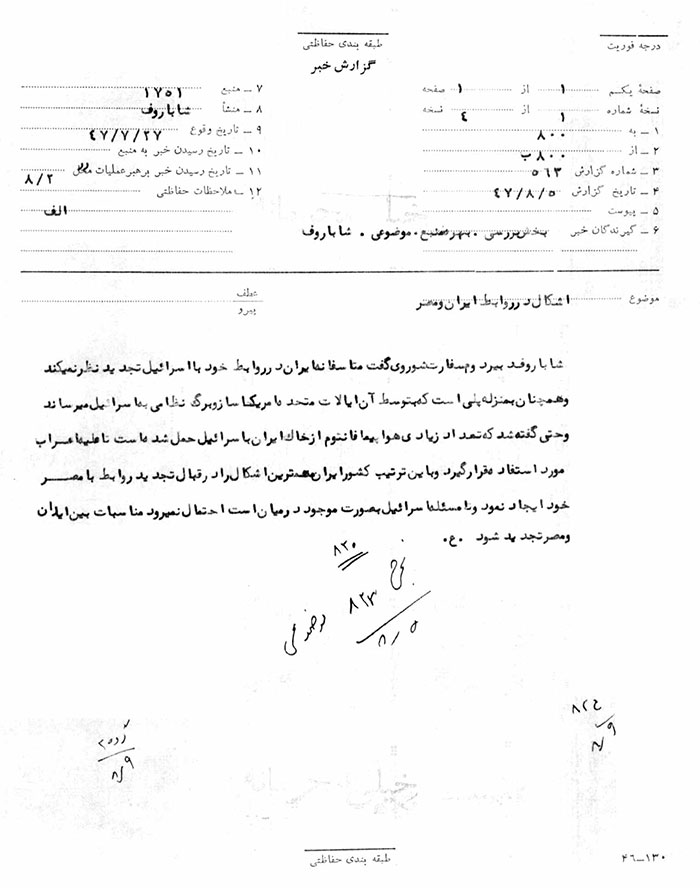 شاباروف دبیر دوم سفارت شوروی گفت: متأسفانه ایران در روابط خود با اسرائیل تجدید نظر نمیکند و همچنان به منزله پلی است که به توسط آن ایالات متحده امریکا ساز و برگ نظامی به اسرائیل میرساند و حتی گفته شد که تعداد زیادی هواپیما فانتوم از خاک ایران به اسرائیل حمل شده است تا علیه اعراب مورد استفاده قرار گیرد و به این ترتیب کشور ایران مهمترین اشکال را در قبال تجدید روابط با مصر خود ایجاد نمود و تا مسئله اسرائیل به صورت موجود در میان است احتمال نمیرود مناسبات بین ایران و مصر تجدید شود. ع
