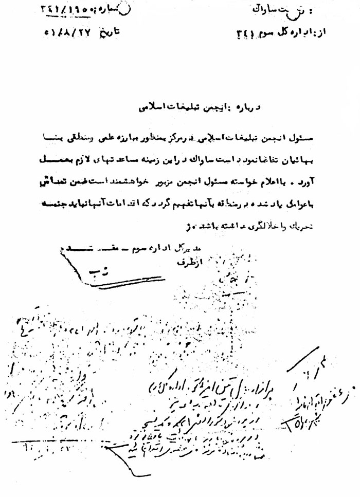 مسئول انجمن تبلیغات اسلامی در مرکز به منظور مبارزه علمی و منطقی با بهائیان تقاضا نموده است ساواک در این زمینه مساعدتهای لازم به عمل آورد. با اعلام خواسته مسئول انجمن مزبور خواهشمند است ضمن تماس با عوامل یاد شده درمنطقه به آنها تفهیم گردد که اقدامات آنها نباید جنبه تحریک و اخلالگری داشته باشد. ز