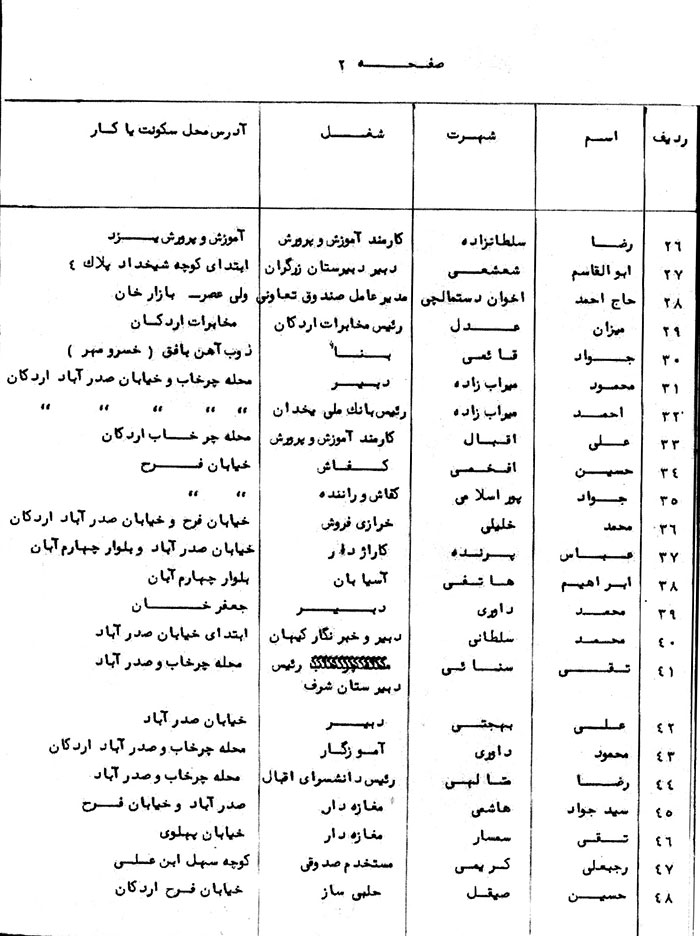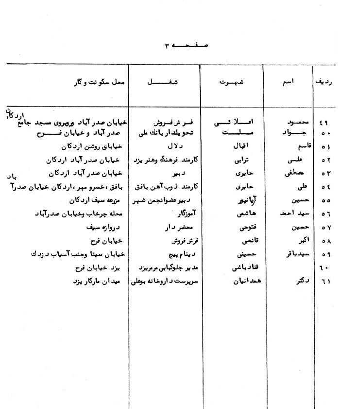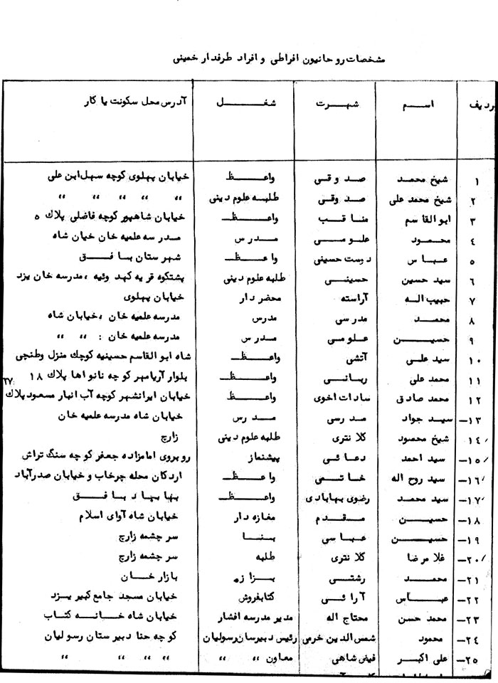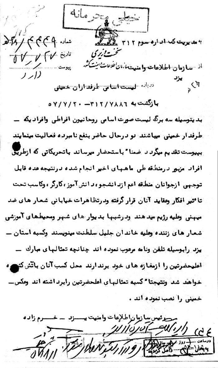 بدین وسیله سه برگ لیست صورت اسامی روحانیون افراطی و افرادی که طرفدار خمینی میباشند و در حال حاضر به نفع نامبرده فعالیت مینمایند به پیوست تقدیم میگردد. ضمناً به استحضار میرساند با تحریکاتی که از طریق افراد مزبور در منطقه طی ماههای اخیر انجام شده در نتیجه عده قابل توجهی از جوانان منطقه اعم از دانشجو، دانش آموز، کارگر و کاسب تحتتأثیر افکار و عقاید آنان قرار گرفته و در تظاهرات خیابانی شعارهای ضد میهنی و علیه رژیم میدهند و در شبها به دیوارهای شهر و محیطهای آموزشی شعارهای زننده و علیه خاندان جلیل سلطنت مینویسند و کسبه استان یزد را به وسیله تلفن و نامه مرعوب نمودهاند چنانچه تمثالهای مبارک اعلیحضرتین را از مغازههای خود بر ندارند محل کسب آنان به آتش کشیده خواهد شد و نتیجتاً کسبه تمثالهای اعلیحضرتین را برداشتهاند و عکس خمینی را نصب نمودهاند.