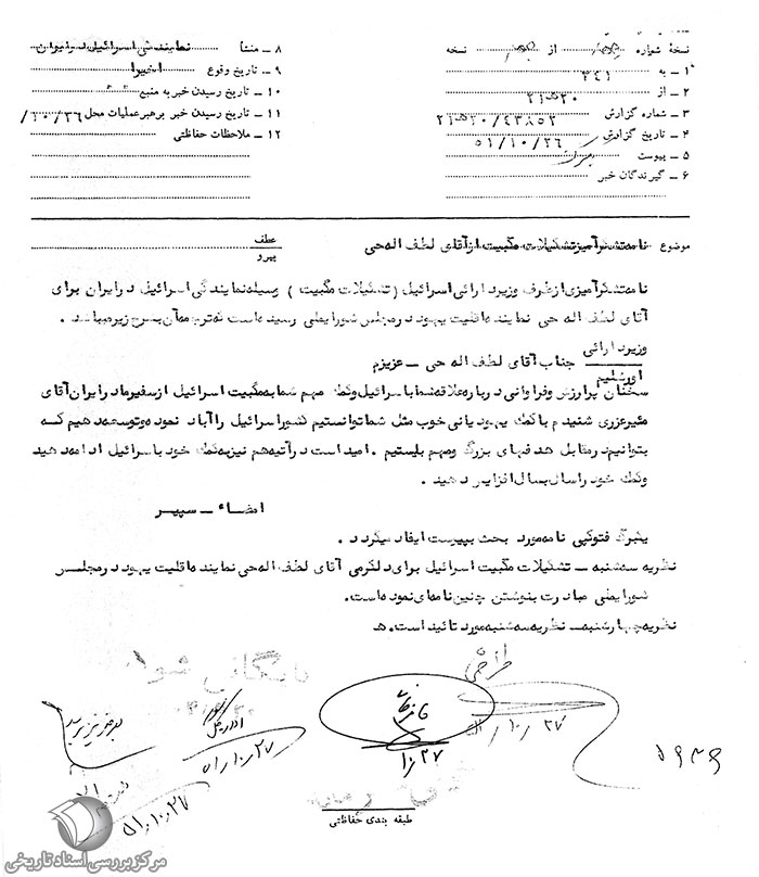 نامه تشکرآمیزی از طرف وزیر دارائی اسرائیل (تشکیلات مگبیت) وسیله نمایندگی اسرائیل در ایران برای آقای لطفاله حی نماینده اقلیت یهود در مجلس شورای ملی رسیده است که ترجمه آن به شرح زیر میباشد.