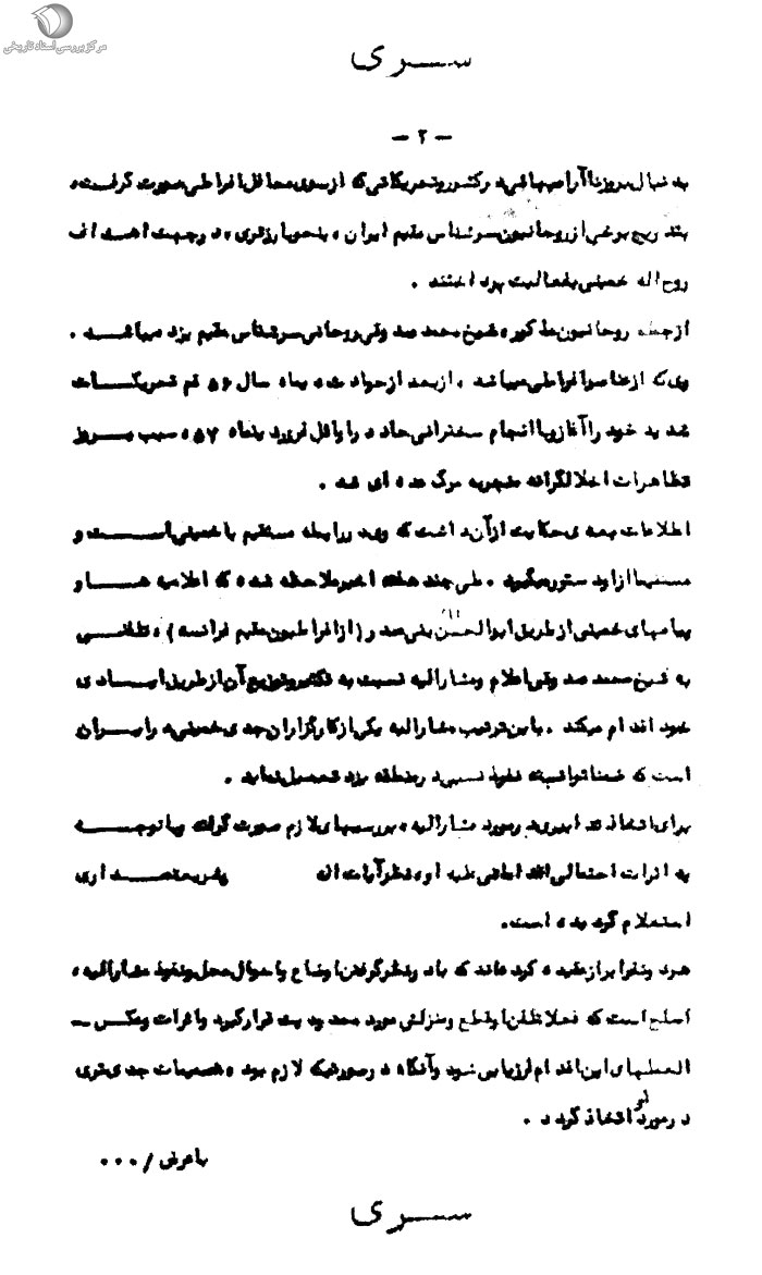 برای اتخاذ تدابیری در مورد مشارالیه، بررسیهای لازم صورت گرفته و با توجه به اثرات احتمالی اقداماتی علیه او، نظر آیتالله...[1] و شریعتمداری استعلام گردیده است.
