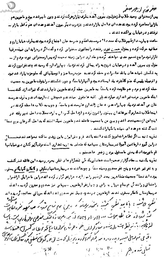 ساعت چهاربعدازظهر طلاب که مجدداً در مسجد اعظم و مدرسه خان اجتماع کرده بودند به طرف خیابان ارم و صفائیه حرکت کرده و به منزل حسین نوری رفتند. در آنجا نوری سخنرانی کرده و گفت: اگر در جراید این قبیل حرفها تکرار شود مراجع تصمیم جدی خواهند گرفت و مقداری در این زمینه صحبت کرد. پس از سخنرانی نوری مردم از منزل وی بیرون آمده و در خیابان شروع به راهپیمایی کردند. نزدیک چهارراه ارم که رسیدند چند نفر شروع کردن به شکستن شیشههای بانک صادرات و حمله کردند به حزب رستاخیز و اتومبیلهایی که جلو حزب پارک شده بود و اتومبیل پلیس که جلو کلانتری یک ایستاده بود و آنها را با سنگ و چوب شکستند. در این وقت مأمورین به جمعیت حمله کردند و مردم هم مقاومت کرده با سنگ به مأمورین حمله کردند. مأمورین ناچار شدند که تیراندازی کنند. با اینکه مأمورین مرتب تیراندازی میکردند ولی طلبهها متفرق نمیشدند و همچنان شعار میدادند و به طرف مدرسه خان میآمدند. نزدیک چهارراه مدرسه خان ژاندارمها رسیدند و با سنگ و چوب به طلابها حمله کردند. در اینجا طلاب شعار مرگ بر خاندان پهلوی را شروع کرده و از داخل گذرخان به طرف محلات داخل شهر رفته. در اینجا من از جمعیت جدا شدم و بین من با جمعیت فاصله شد و مأمورین نمیگذاشتند که به داخل گذرخان بروم. ضمناً شب گذشته هم عدهای شیشه بانکها را شکستند.