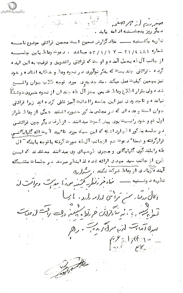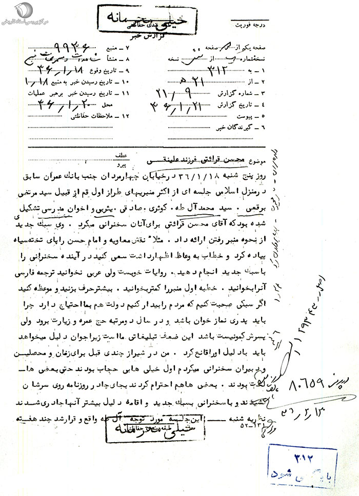 نظریه یکشنبه ـ مفاد گزارش صحیح است محسن قرائتی موضوع نامه شماره 4981 / 21 ـ 17 / 9 / 53 میباشد. دعوت وعاظ به این جلسه از جانب آلطه به عمل آمده و اوست که قرائتی را تشویق و ترغیب به این ایده کرده. قرائتی چندیست که به فکر نوآوری در نحوه وعظ و خطابه افتاده و خود نیز به همین کیفیت عمل میکند. متد جدید وی مورد توجه طلاب جوان واقع شده ولی به قرار اطلاع وعاظ قدیمی به جز آلطه چندان از نحوه مبنر وی خوششان نیامده و تا حدودی نیز این جلسه را اهانتآمیز تلقی کردهاند زیرا قرائتی جوان است و عدهای که در مجلس مذکور حضور داشتند همگی از وعاظ طراز اول قم و خود را نسبت به وی پیشکسوت میدانند. از طرف دیگر چون قرائتی در جلسه مذکور اظهار داشته که این سبک مورد تائید آیتالله گلپایگانی قرار گرفته و ضمناً دعوت هم از جانب آلطه صورت گرفته با توجه به اینکه آلطه را بلندگوی گلپایگانی و مجری طرحهای وی می دانند معتقدند که این طرح از جانب سیدمهدی ارائه شده لذا به نظر میرسد در جلسات متشکله آینده تعداد زیادی از وعاظ شرکت نکنند. شراره