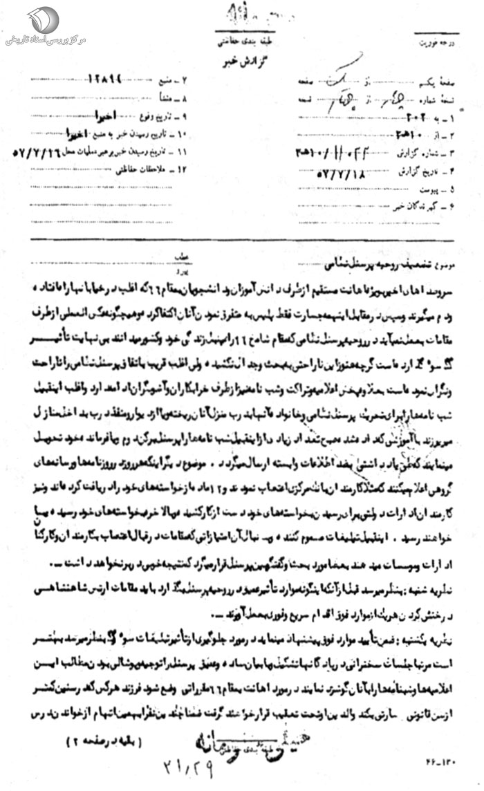 سر و صداهاى اخیر به ویژه اهانت مستقیم از طرف دانشآموزان و دانشجویان به مقام 66 [شاه] که اغلب در خیابانها راه افتاده و دم میگیرند و سپس در مقابل این همه جسارت فقط پلیس به متفرق نمودن آنان اکتفا کرده و هیچگونه عکسالعملى از طرف مقامات به عمل نمیآید، در روحیه پرسنل نظامى که مقام شامخ 66 را سنبل زندگى خود و کشور میدانند بىنهایت تأثیر سوء گذارده است. گرچه هنوز این ناراحتى به بحث و جدال نکشیده ولى اغلب قریب به اتفاق پرسنل نظامى را ناراحت و نگران نموده است، به علاوه پخش اعلامیه و تراکت و شبنامه نیز از طرف خرابکاران و آشوبگران ادامه دارد و اغلب این قبیل شبنامهها را براى تحریک پرسنل نظامى و خانواده آنها به درب منزل آنان ریخته و یا از دیوار و منفذ درب به داخل منازل میریزند. با آموزشى که داده شده صبح تعداد زیادى از این قبیل شبنامهها را پرسنل به رکن دوم و یا فرمانده خود تحویل مینمایند که طى یادداشتى به ضد اطلاعات وابسته ارسال میگردد. موضوع دیگر اینکه هر روز در روزنامهها و رسانههاى گروهى اعلام میکنند که مثلاً کارمندان بانک مرکزى اعتصاب نمودند و 12 ماده از خواستههاى خود را دریافت کردهاند و نیز کارمندان ادارات دولتى براى رسیدن به خواستههاى خود دست از کار کشیده و بالاخره به خواستههاى خود رسیده یا خواهند رسید. این قبیل تبلیغات مسموم کننده و به دنبال آن امتیازاتى که مقامات در قبال اعتصاب به کارمندان و کارکنان ادارات و مؤسسات میدهند بعضاً مورد بحث و گفتگو بین پرسنل قرار میگیرد که نتیجه خوبى در برنخواهد داشت.
