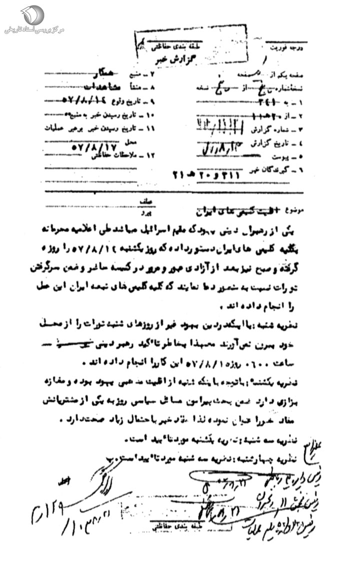 یکى از رهبران دینى یهود که مقیم اسرائیل میباشد طى اعلامیه محرمانه به کلیه کلیمىها ایران دستور داده که روز یکشنبه 14 / 8 / 57 را روزه گرفته و صبح نیز بعد از آزادى عبور و مرور در کنیسه حاضر و ضمن سر گرفتن تورات نسبت به منصور[شاه] دعا نمایند که کلیه کلیمىهاى تبعه ایران این عمل را انجام دادهاند.