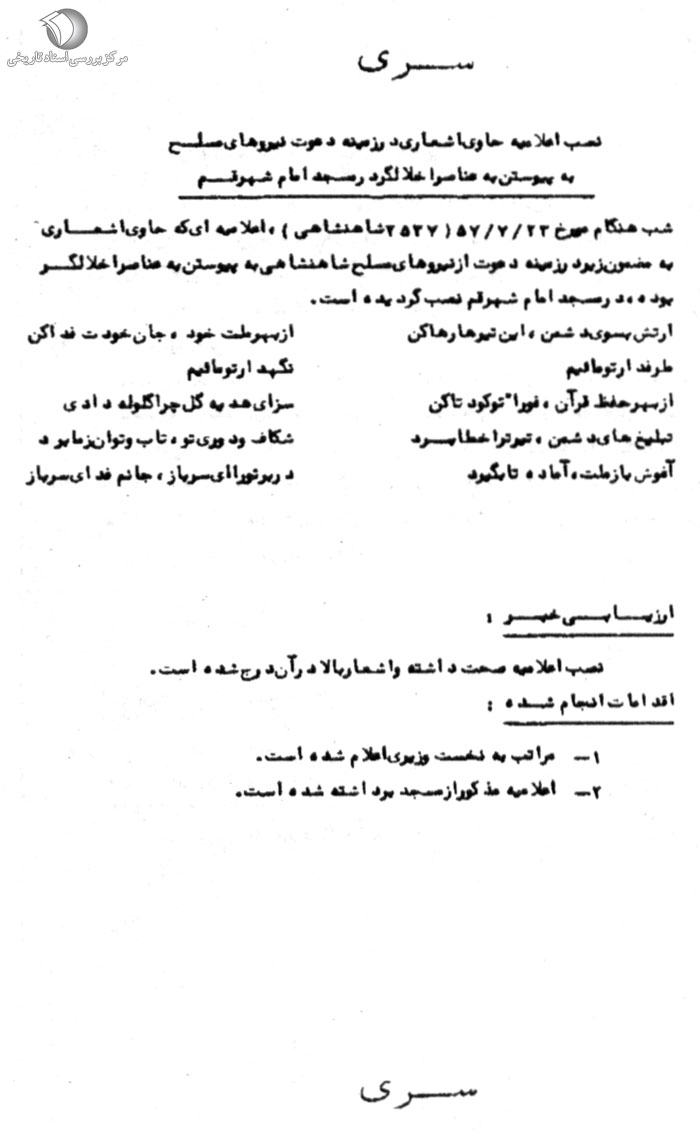 شب هنگام مورخ 23 / 7 / 57 (2537 شاهنشاهى)، اعلامیهاى که حاوى اشعارى به مضمون زیر در زمینه دعوت از نیروهاى مسلح شاهنشاهى به پیوستن به عناصر اخلالگر بوده، در مسجد امام شهر قم نصب گردیده است.
