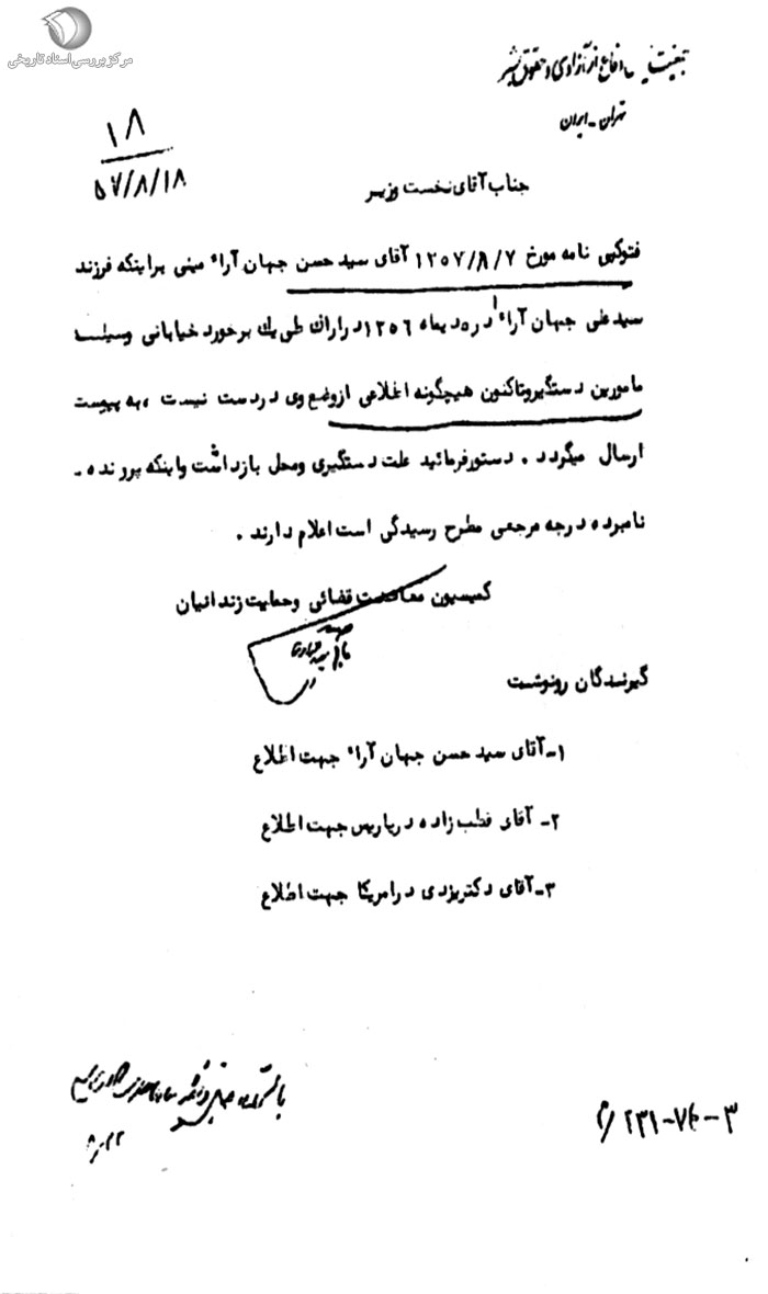 فتوکپى نامه مورخ 7 / 8 / 1357 آقاى سید حسن جهان آراء مبنى بر اینکه فرزندش سید على جهان آراء1 در 5 دیماه 1356 در اراک طى یک برخورد خیابانى وسیله مأمورین دستگیر و تاکنون هیچگونه اطلاعى از وضع وى در دست نیست، به پیوست ارسال میگردد. دستور فرمائید علت دستگیرى و محل بازداشت و اینکه پرونده نامبرده در چه مرجعى مطرح رسیدگى است اعلام دارند.