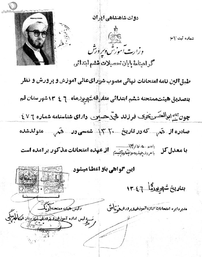 شهید اندرزگو و گواهینامه تحصیلات ششم ابتدایی با نام ابوالحسن نحوی