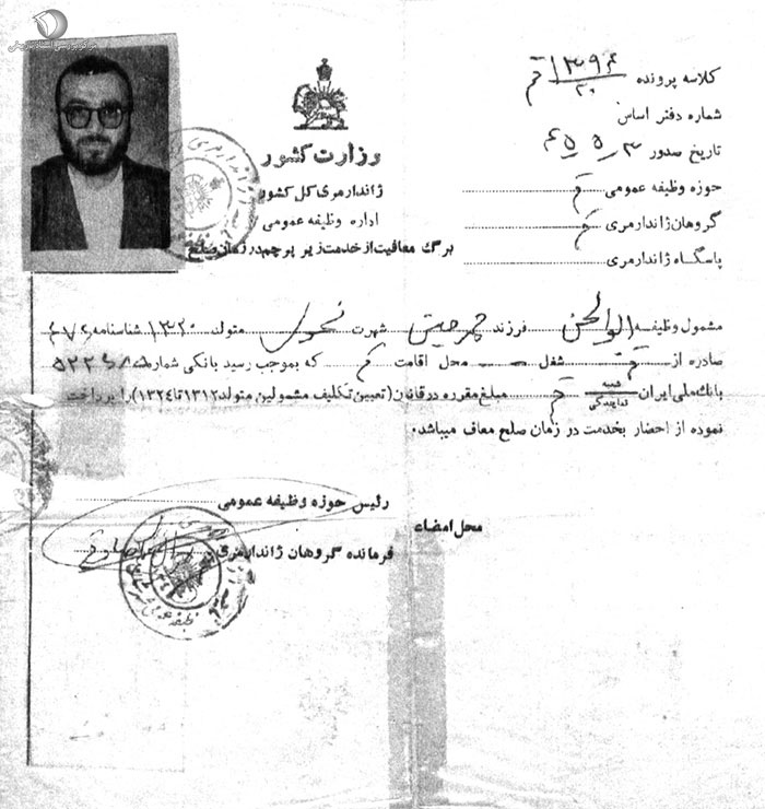 برگ معافیت از خدمت شهید حجت الاسلام اندرزگو با نام نحوی