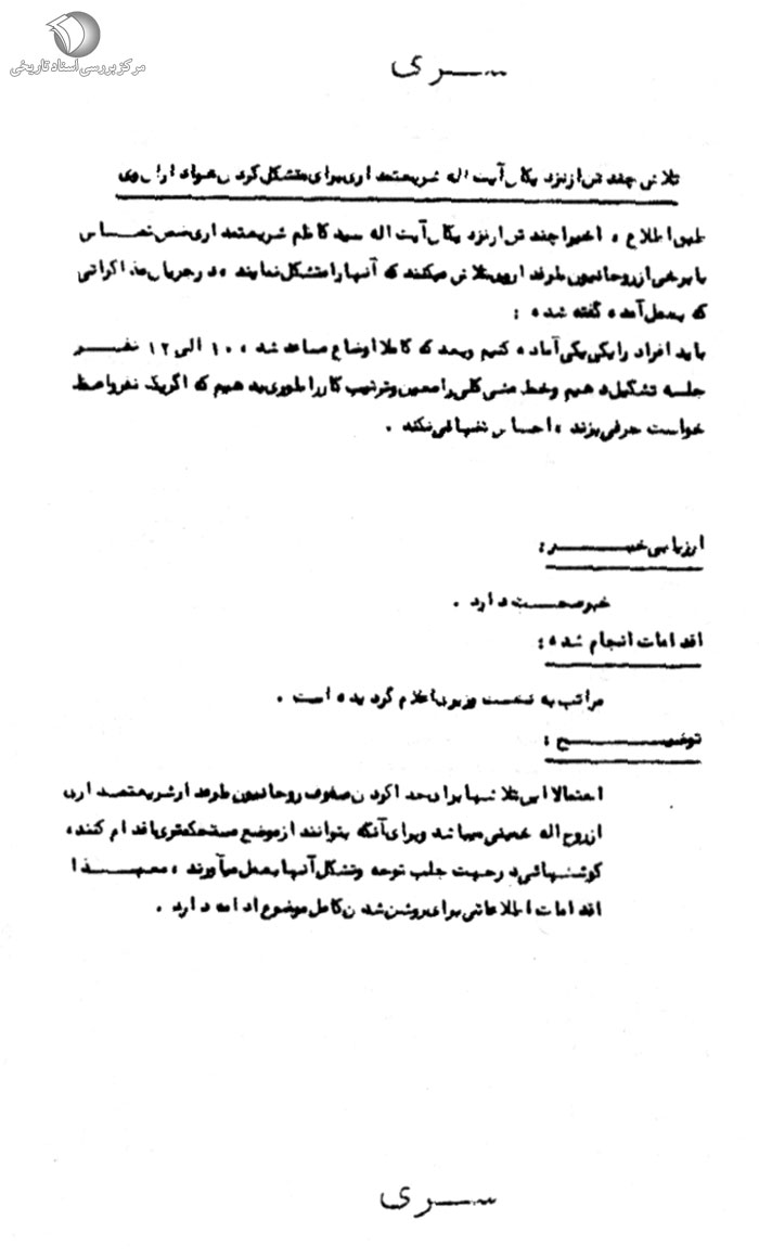 احتمالاً این تلاشها براى جدا کردن صفوف روحانیون طرفدار شریعتمدارى از روحاللّه خمینى میباشد و براى آن که بتوانند از موضع مستحکمترى اقدام کنند، کوششهائى در جهت جلب توجه و تشکل آنها به عمل میآورند، معهذا اقدامات اطلاعاتى براى روشن شدن کامل موضوع ادامه دارد.