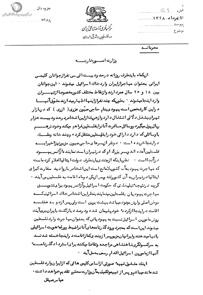 از یک ماه به این طرف روزانه در حدود بیست الی سی نفر از جوانان کلیمی ایرانی به عنوان مهاجر از ایران وارد خاک اسرائیل میشوند. این جوانان بین 18 و 25 سال عمر دارند و از نقاط مختلف کشور مخصوصاً از تهران وارد اینجا میشوند. به طوری که چند نفر از اینها اظهار میدارند مشوق آنها در این کار شخصی است یهودی به نام حاجی صیون عزری (ازری) که در بازار تهران به شغل دلالی اشتغال دارد و از هر یک از این اشخاص در حدود بیست هزار ریال پول میگیرد و وسائل مسافرت آنان را به فلسطین فراهم میکند و خودش هم با وسائلی که دارد دارائی خود را به فلسطین منتقل کرده و چند خانه و ملک در اینجا خریده است. دو نفر از پسرهای حاجی صیون مزبور نیز اخیراً به فلسطین آمدهاند و پسر بزرگ او که در تهران است نماینده آژانس یهود در آنجا است. نظر به اینکه از چندی به این طرف دولت ایتالیا اعلام کرده است که مهاجرت یهود به آن کشور بلامانع است این اشخاص با روادید سفارت کبرای ایتالیا در تهران به آن کشور رفته و پس از یکی دو ماه اقامت به فلسطین میآیند. به نظر این اشخاص خاک اسرائیل که موطن اصلی و ارض موعود میباشد بهشت برین است ولی پس از دو سه هفته اقامت در اینجا از کردهی خود پشیمان شده و در صدد بازگشت به ایران بر میآیند روش مأمورین اسرائیل نسبت به یهودیانی که به عنوان مهاجرت وارد فلسطین میشوند این است که به مجرد ورود گذرنامههای آنان را ضبط و ورقهی هویت اسرائیلی به آنها میدهند و ایرانیان مزبور پس از چندی که از اقامت در اینجا خسته شدند به سرکنسولگری شاهنشاهی مراجعه و تقاضا میکنند برای استرداد گذرنامهی آنها از مأمورین اسرائیل اقدام رسمی به عمل آید.
