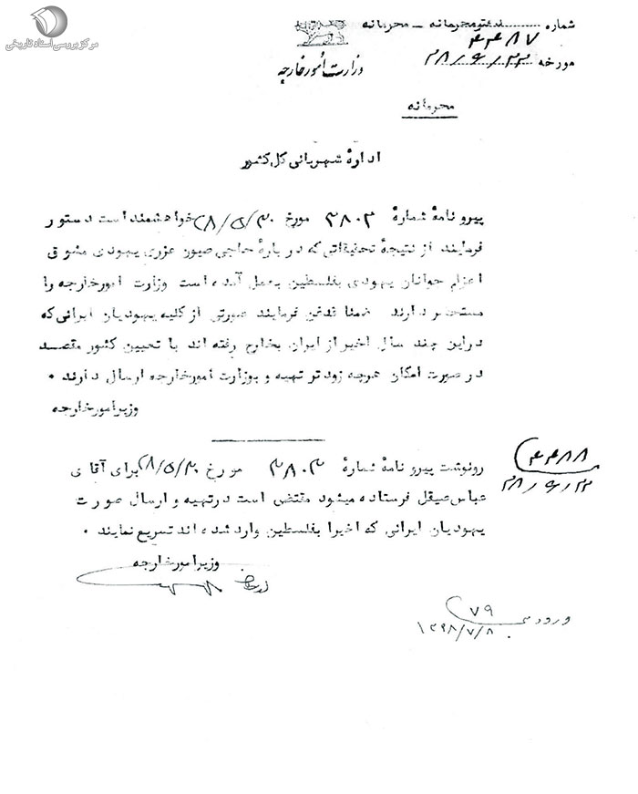 پیرو نامهی شمارهی 3802 مورخ 30 / 5 / 28 خواهشمند است دستور فرمایند از نتیجهی تحقیقاتی که دربارهی حاجی صیون عزری یهودی مشوق اعزام جوانان یهودی به فلسطین به عمل آمده است وزارت امور خارجه را مستحضر دارند ضمناً قدغن فرمایند صورتی از کلیه یهودیان ایرانی که در این چند سال اخیر از ایران به خارج رفتهاند با تعیین کشور مقصد در صورت امکان هر چه زودتر تهیه و به وزارت امور خارجه ارسال دارند.