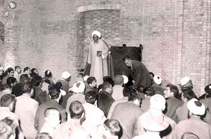 آیتالله کفعمی در حال ایراد خطبه های نماز جمعه.قبل از پیروزی انقلاب اسلامی