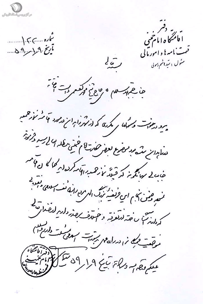 دفتر اقامتگاه امام خمینی قسمت نامه ها و امورمالی شماره: 122