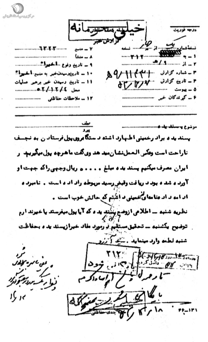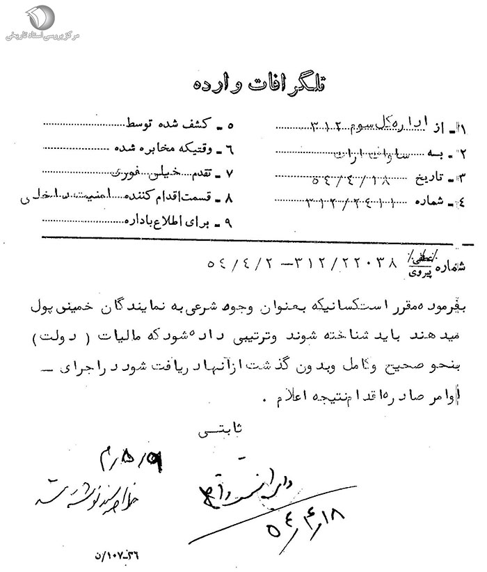 به فرموده مقرر است کسانی که به عنوان وجوه شرعی به نمایندگان خمینی پول میدهند باید شناخته شوند و ترتیبی داده شود که مالیات (دولت) به نحو صحیح و کامل بدون گذشت از آنها دریافت شود در اجرای اوامر صادره اقدام نتیجه اعلام.