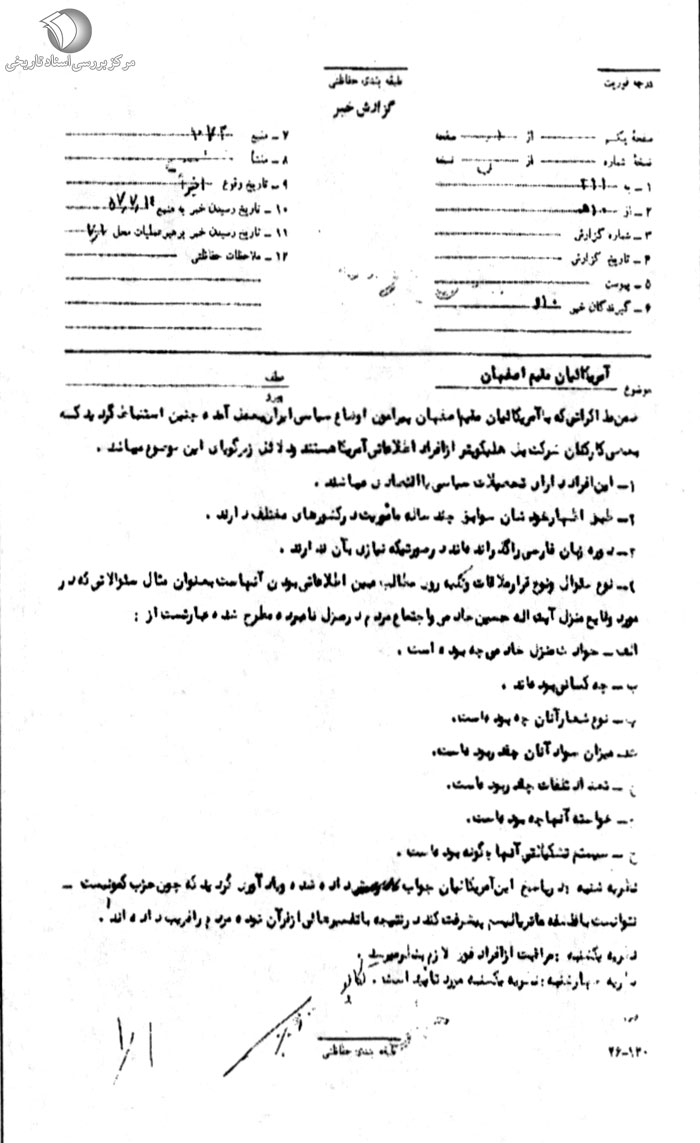 1ـ مأمورین امنیتى شرکت بل هلیکوپتر بسیار کنجکاو هستند و سعى مینمایند از هر حادثهای که در اصفهان به وجود میآید مانند خرابکارى و آتش سوزى مؤسسات دولتى و خصوصى تحقیق و از چگونگى اوضاع کسب خبر نمایند.