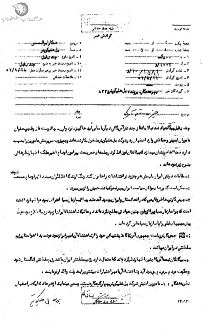 چندى قبل بیگانه یاد شده بالا به اتفاق چند نفر آمریکایى دیگر به اسامى «لید هاکینز ـ فرد وارن ـ چاک وست فال و فلچر» به عنوان مأموران امنیتى و حفاظتى وارد اصفهان و در شرکت بل هلیکوپتر مشغول به کار شدهاند و «جیمز وب» سرپرستى مأمورین را به عهده دارد. ضمناً خاطر نشان میسازد که بیگانگان فوقالذکر در جلسهاى ضمن بحث پیرامون اوضاع اخیر مملکت اظهار نظرهایى به شرح زیر نمودهاند.