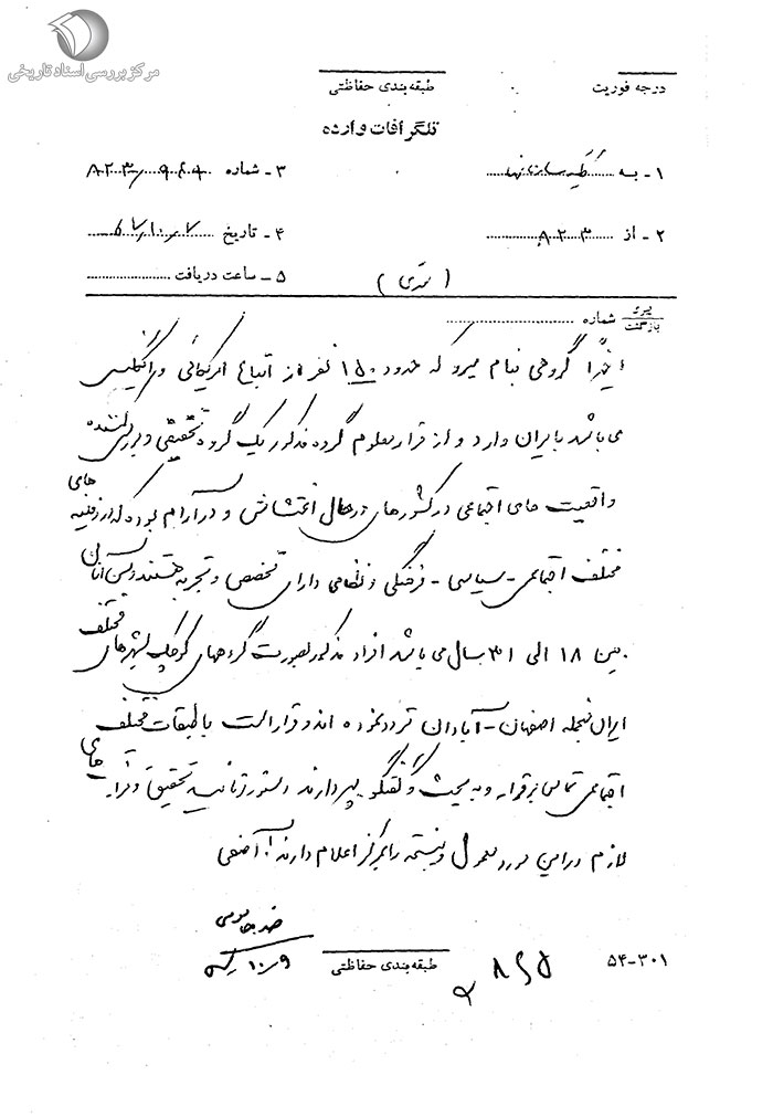 اخیراً گروهى به نام «میرو» که حدود 150 نفر از اتباع امریکایى و انگلیسى مىباشد به ایران وارد و از قرار معلوم گروه مذکور یک گروه تحقیقى و بررسى کننده واقعیتهاى اجتماعى در کشورهاى در حال اغتشاش و در آرام بوده که در زمینههاى مختلف اجتماعى ـ سیاسى ـ فرهنگى و نظامى داراى تخصص و تجربه هستند و سن آنان بین 18 الى 31 سال مىباشد. افراد مذکور به صورت گروههاى کوچک به شهرهاى مختلف ایران منجمله اصفهان ـ آبادان تردد نمودهاند و قرار است با طبقات مختلف اجتماعى تماس برقرار و به بحث و گفتگو بپردازند. دستور فرمایید تحقیق و مراقبتهاى لازم در این مورد معمول و نتیجه را به مرکز اعلام دارند. آصفى