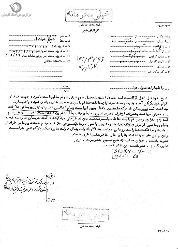 1ـ از ساواک قم مشخصات بیشتر سوابق این روحانی استعلام شود و دستور مراقبت دقیق از وی داده شد.13 / 12