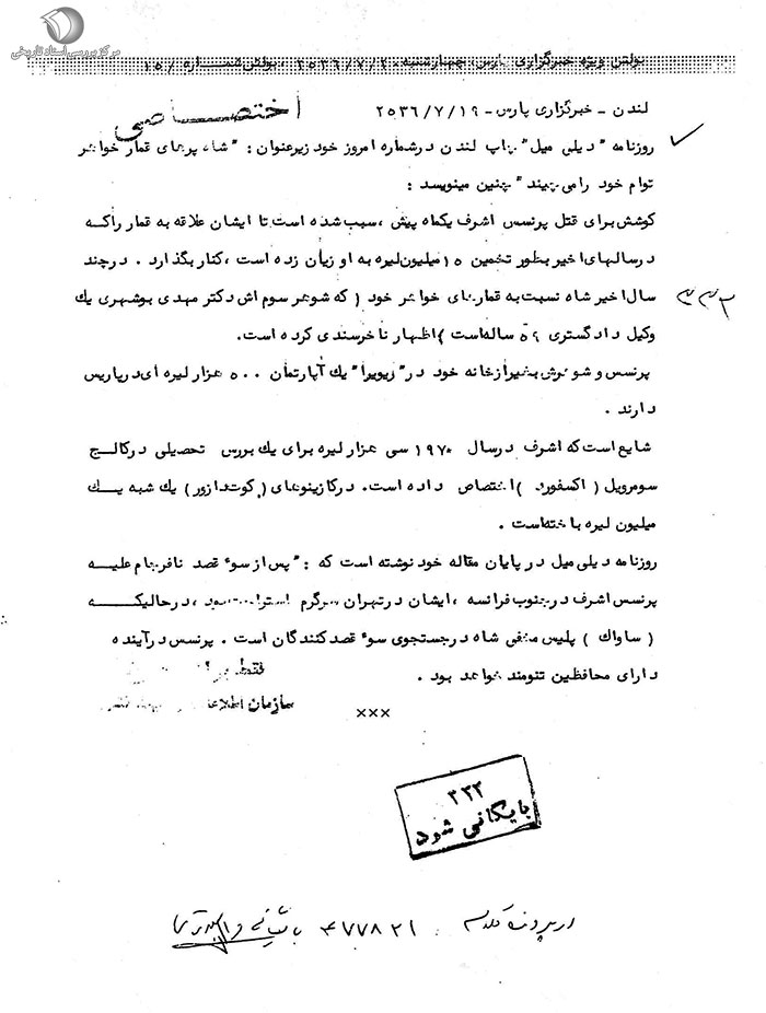 کوشش برای قتل پرنسس اشرف یکماه پیش، سبب شده است تا ایشان علاقه به قمار را که در سالهای اخیر به طور تخمین 15 میلیون لیره به او زیان زده است، کنار بگذارد. در چند سال اخیر شاه نسبت به قمارهای خواهر خود (که شوهر سومش دکتر مهدی بوشهری یک وکیل دادگستری 59 ساله است) اظهار ناخرسندی کرده است.