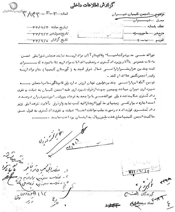 نوراله حی مدیر شرکت احیاء و قائم مقام آقای مراد اریه نماینده مجلس شورای ملی، ضمن ملاقات خصوصی با آقای وزیر دادگستری در تعقیب اقدامات مراد اریه تقاضا نموده که برای ثبت چندین هزار متر از اراضی شمال شرقی امجدیه (گورستان کلیمیها) به نام مراد اریه رئیس انجمن کلیمیها اقدام کنند.