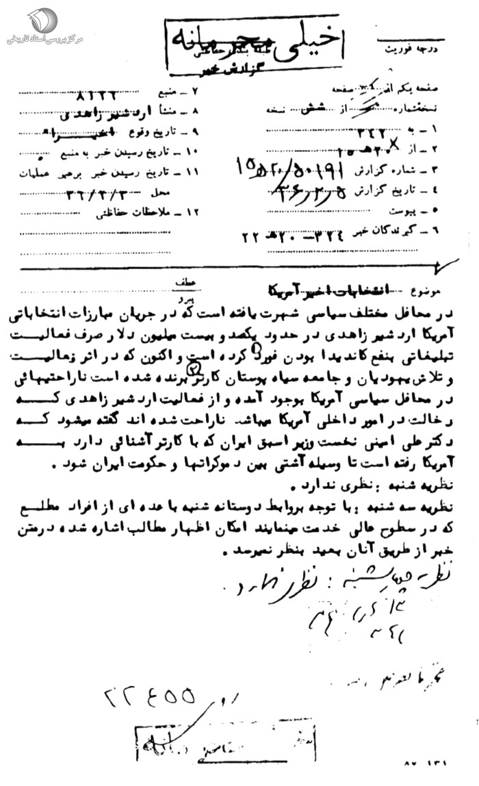 در محافل مختلف سیاسی شهرت یافته است که در جریان مبارزات انتخاباتی آمریکا اردشیر زاهدی در حدود یکصد و بیست میلیون دلار صرف فعالیت تبلیغاتی به نفع کاندیدا بودن فورد کرده است و اکنون که در اثر فعالیت و تلاش یهودیان و جامعه سیاه پوستان کارتر برنده شده است ناراحتیهایی در محافل سیاسی آمریکا به وجوده آمده و از فعالیت اردشیر زاهدی که دخالت در امور داخلی آمریکا میباشد، ناراحت شدهاند. گفته میشود که دکتر علی امینی نخستوزیر اسبق ایران که با کارتر آشنایی دارد به آمریکا رفته است تا وسیله آشتی بین دموکراتها و حکومت ایران شود.